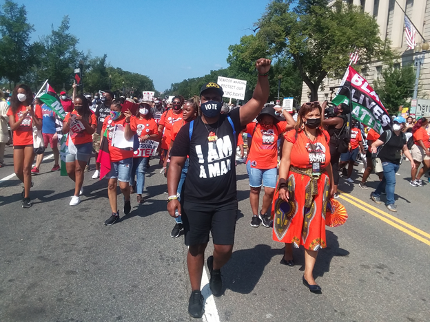 Listening to the speakers and feeling the predominantly Black folks around me at the pre-march rally and during the march, it wasn’t the same. For African Americans it is literally a matter of life and death, grounded in centuries of slavery and Jim Crow segregation and institutionalized racism, underlined by today’s out-in-the-open efforts by Republican white supremacists in state legislatures around the country to hijack elections via voter suppression.